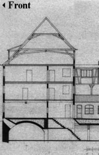 In the course of this restoration there will be an analysis of the complete construction history of Schlenkerla. Priliminary works suggest, that originally the house was only one story high and was ammended with a second floor and a new rear plus staircase in the 17th century. As can be seen in the side view of the building, the arched cellar is smaller than todays Schlenkerla. Its right wall correspondes with walls in the levels above; probably the old back side of the house.